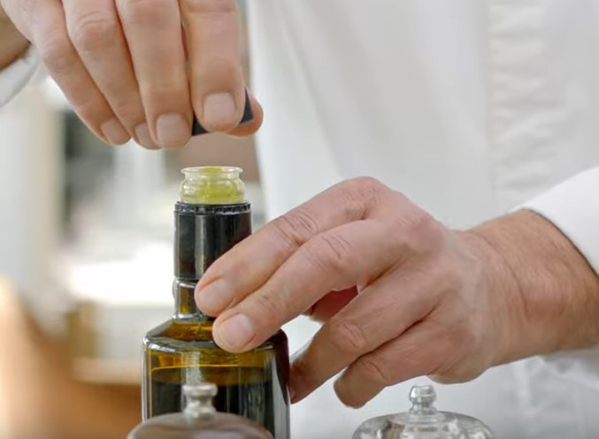 Il testo accompagna le immagini di uno chef che versa olio di oliva extra vergine di qualità - e lo si capisce perché la bottiglia è ripresa in dettaglio: di vetro scuro e con tappo anti rabbocco. Lo chef versa l’olio prima in una pentola - mostrando quindi che è consigliabile utilizzare olio di qualità anche per la cottura - e poi lo versa sul piatto finito per esaltarne i sapori. Queste immagini si alternano a quelle di un pittore impegnato a dipingere con colori a olio il ritratto di una graziosa ragazza che, immersa nella natura, tiene in mano una brocca piena di olio dal profumo inebriante.