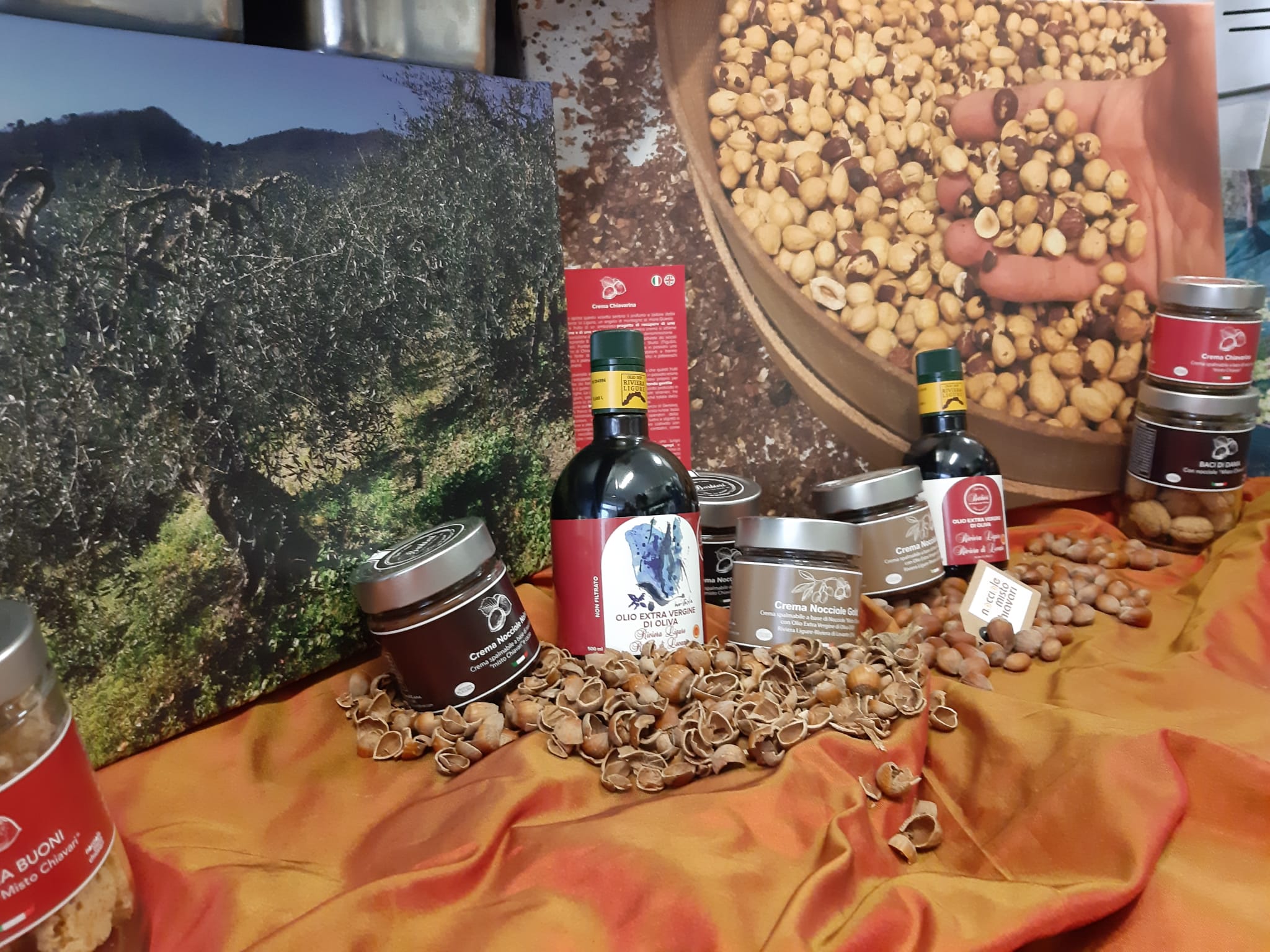 A fianco delle confezioni della crema spalmabile, le bottiglie dell’Olio Dop Riviera ligure che l’azienda ha saputo valorizzare con una particolare etichetta disegnata dal pittore Luiso Sturla.
