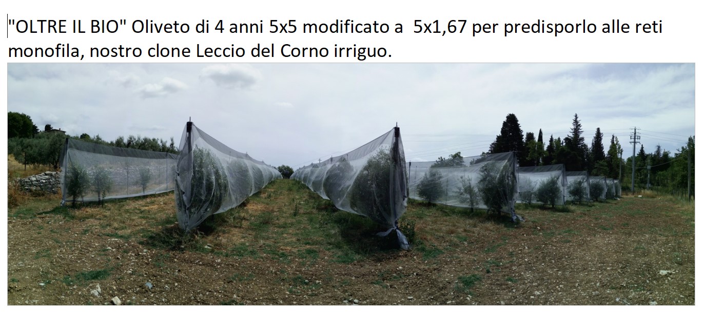 Oltre a questo due titolari di azienda hanno creduto in una mia idea e da loro abbiamo realizzato l'oliveto oltre il bio, si tratta di copertura in oliveti a filare con reti antiinsetto monofila, oggi 30 luglio 2019 abbiamo le prime risposte di questo lavoro: in un oliveto di mezzo ettaro con piante di quattro anni, gia in produzione della cultivar Leccio del Corno nostro clone, piante prodotte in partenership con S.P.O. Olivi Pescia. Due giorni fa abbiamo eseguito il terzo controllo alle trappole con feromoni per la mosca, il risultato ci da una media settimanale di nove catture per trappola negli olivi esterni alle reti, mentre le tre trappole all'interno delle reti ci danno solo due catture in una trappola nella prima settimana di monitoraggio.