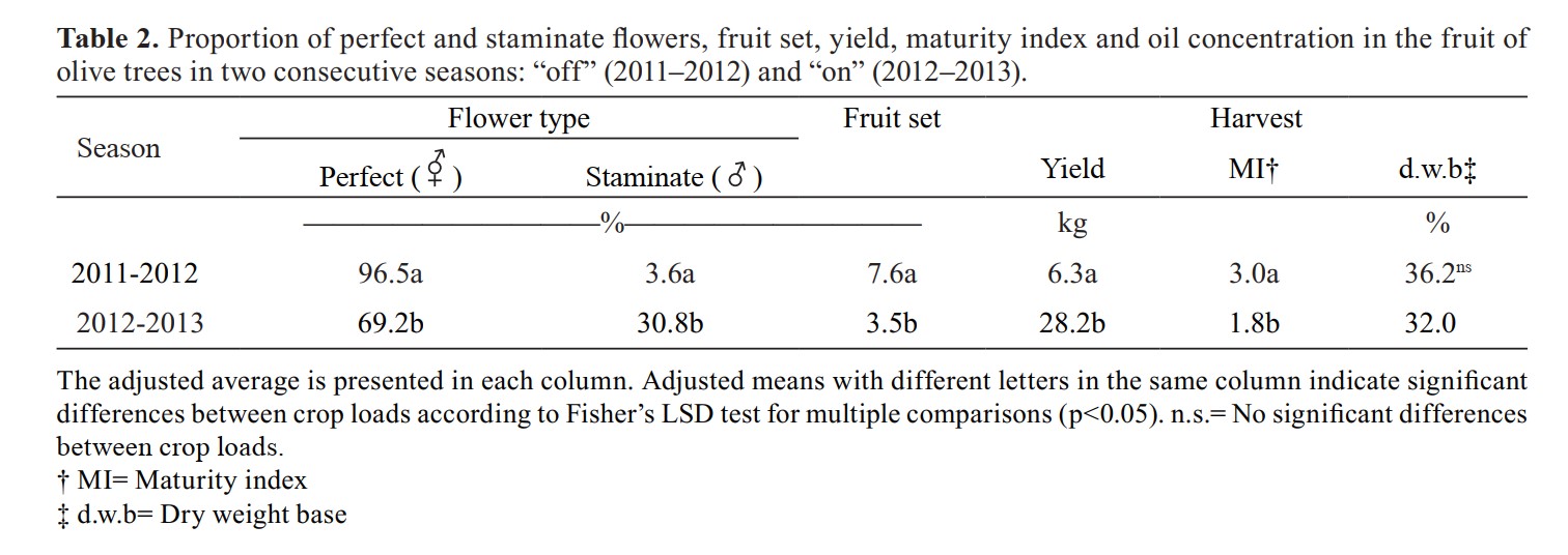 Questi risultati suggeriscono un meccanismo di compensazione parziale del carico della coltura in condizioni di bassa fioritura. Questo meccanismo, tuttavia, non compensa la minore produzione nella stagione "off".