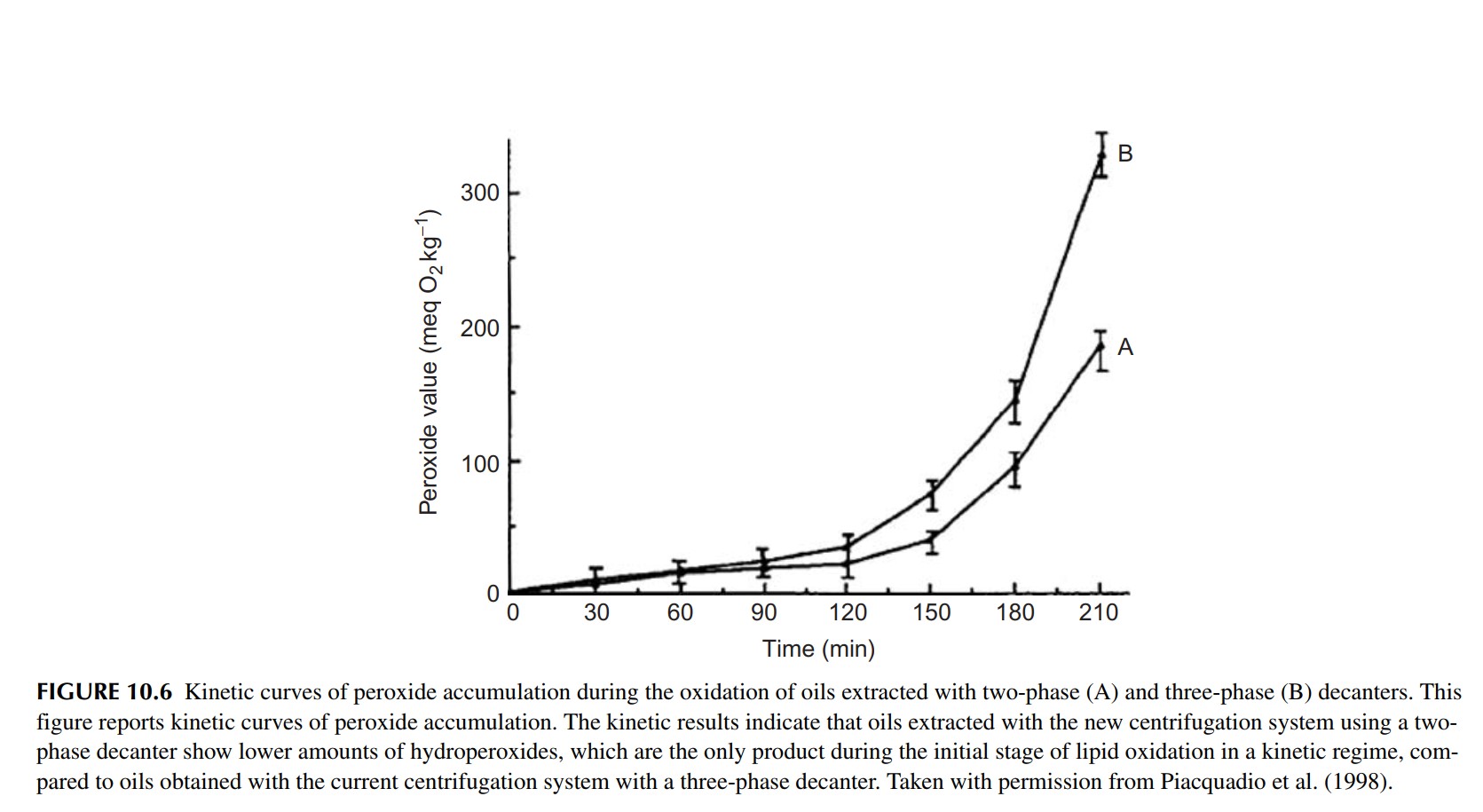 Il decanter bifasico porta a oli con alti contenuti di componenti fenolici, che sono antiossidanti naturali e, di conseguenza, producono oli di buona qualità con una maggiore resistenza all'autossidazione. Ciò è confermato dalle curve cinetiche dell'accumulo di perossidi. I risultati cinetici indicano che gli oli estratti con il sistema di centrifugazione che utilizza un decanter a due fasi mostrano quantità inferiori di idroperossidi, che sono l'unico prodotto durante la fase iniziale dell'ossidazione lipidica in un regime cinetico, rispetto agli oli ottenuti con l'attuale sistema di centrifugazione con decanter trifase.