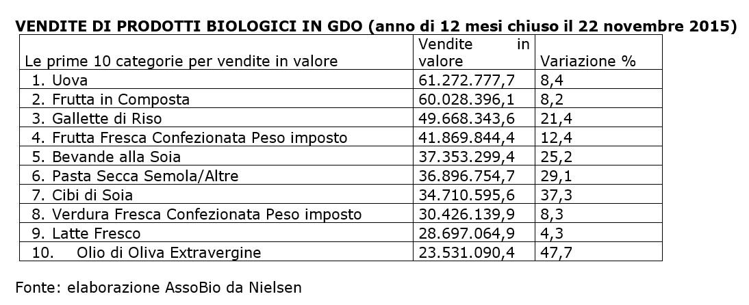 Lo studio ha analizzato le preferenze dei consumatori italiani rivelando che i prodotti biologici più venduti in Italia sono le uova. Nel 2015 le vendite di uova bio hanno raggiunto un fatturato di oltre 61 milioni di euro attestandosi a quota +8,4% rispetto al 2014. Le vendite di composte di frutta bio, reputate più sane e gustose di marmellate e confetture tradizionali, hanno registrato una crescita dell’8,2% fatturando oltre 60 milioni di euro e piazzandosi al secondo posto tra i prodotti bio più venduti. Al terzo posto si piazzano le gallette di riso con una crescita del 21,4% rispetto al 2014 e un fatturato di 50 milioni di euro.